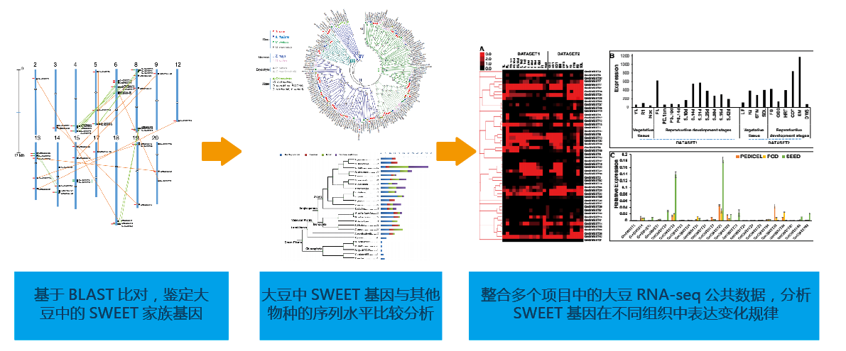 SWEET基因家族在植物體內(nèi)的糖運(yùn)輸、免疫及生殖組織發(fā)育過程中發(fā)揮著非常重要的作用。研究者使用擬南芥、水稻中的SWEET家族基因序列,通過BLAST比對,鑒定到了大豆中的52個(gè)SWEET基因。