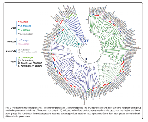 為了了解不同物種中SWEET家族基因的進(jìn)化關(guān)系,研究者對大豆中的SWEET家族基因與其他13個(gè)物種(包括水稻、擬南芥、玉米在內(nèi))中的SWEET基因構(gòu)建系統(tǒng)進(jìn)化樹。