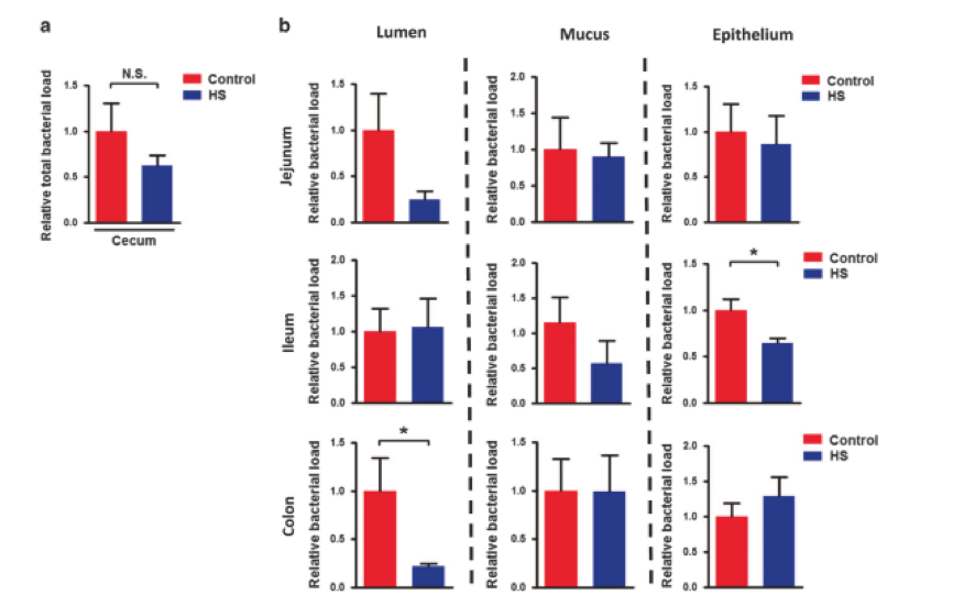 首先,研究人員檢查HS攝入是否會影響腸道細(xì)菌。慢性HS喂養(yǎng)后,盲腸中的總細(xì)菌負(fù)荷略有下降,但無顯著變化(圖1a)。慢性HS喂養(yǎng)后,回腸上皮(圖1b)和結(jié)腸腔內(nèi)(圖1b)的細(xì)菌負(fù)荷也降低。慢性HS處理顯著降低厚壁菌門和提高擬桿菌的水平,這表明細(xì)菌組合物在HS攝入后發(fā)生改變。