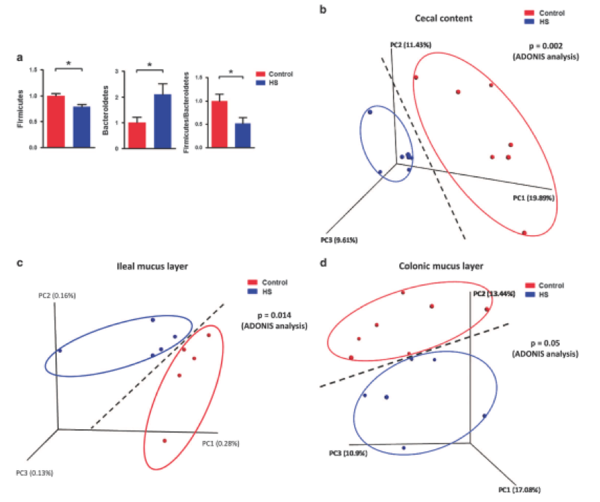 為了研究HS攝入如何影響腸道微環(huán)境,研究人員將HS組的細(xì)菌組成與對照組相比,在HS處理后,盲腸中Actinobacteria,F(xiàn)irmicutes和Bacteroidetes在門水平和Actinobacteria以及Clostridia和Bacteroidia的百分比顯著不同。unweighted uniFrac分析結(jié)果顯示HS和對照組分別聚集(圖2b)。進(jìn)一步分析顯示,HS和對照組在回腸粘液層分別聚集(圖2c),而對照組和HS組形成兩個聚類,分離趨勢明顯在結(jié)腸粘液層(圖2d)。研究結(jié)果表明,慢性HS喂養(yǎng)可能導(dǎo)致腸道生態(tài)失調(diào),細(xì)菌計(jì)數(shù)和微環(huán)境組成的變化也證明了這一點(diǎn)。