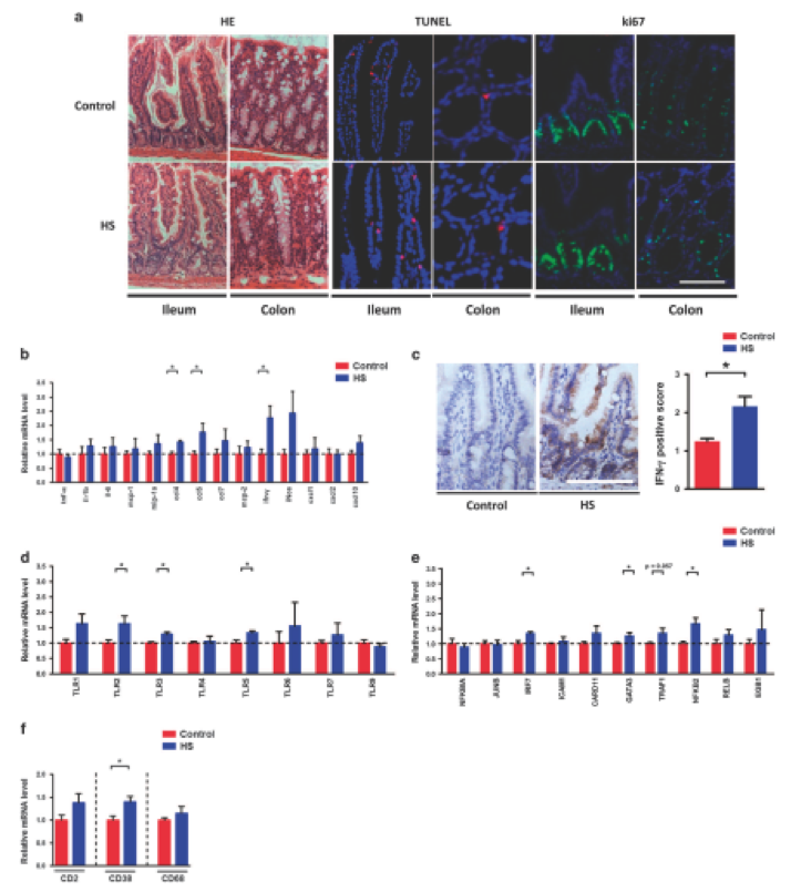 腸道生態(tài)失調(diào)通常與腸道病理生理學(xué)的改變有關(guān),研究人員檢查了慢性HS喂養(yǎng)對腸道變化的影響。在對照組和HS-喂養(yǎng)組小鼠的回腸和結(jié)腸上皮細(xì)胞形態(tài)沒有差異(圖3a)。此外,通過TUNEL和ki67染色鑒定的相似數(shù)量凋亡和增殖細(xì)胞表明,慢性HS喂養(yǎng)不影響腸道中的細(xì)胞死亡(圖3a)。然而,研究人員發(fā)現(xiàn)炎癥標(biāo)志物表達(dá)被慢性HS攝入顯著改變。特別是,Ccl4,Ccl5和Ifn-γ在HS小鼠的回腸中表現(xiàn)出更高的mRNA水平(圖3b)。 IFN-γ免疫組織化學(xué)在回腸中的結(jié)果證實(shí)了基因表達(dá)數(shù)據(jù)(圖3c)。由于TLR家族蛋白和Nf-κB是參與病原體相關(guān)免疫應(yīng)答的主要分子,進(jìn)一步評估TLR家族和Nf-κB基因表達(dá),發(fā)現(xiàn)TLR2,TLR3和TLR5mRNA水平在回腸中趨于更高(圖3d)。同時,HS處理后IRF7,GATA3和NFKB2的表達(dá)顯著上調(diào)(圖3e)。此外,HS喂養(yǎng)后白細(xì)胞中CD38的表達(dá)在回腸中升高(圖3f)。然后通過RNA測序進(jìn)行轉(zhuǎn)錄組分析,并比較涉及“細(xì)胞因子 – 細(xì)胞因子受體相互作用”,“ NF-κB信號通路“和”Toll樣受體信號通路“。在回腸和結(jié)腸中,兩組之間許多基因的表達(dá)是不同的。總的來說,這些數(shù)據(jù)表明慢性HS攝入導(dǎo)致腸炎癥反應(yīng)中斷。