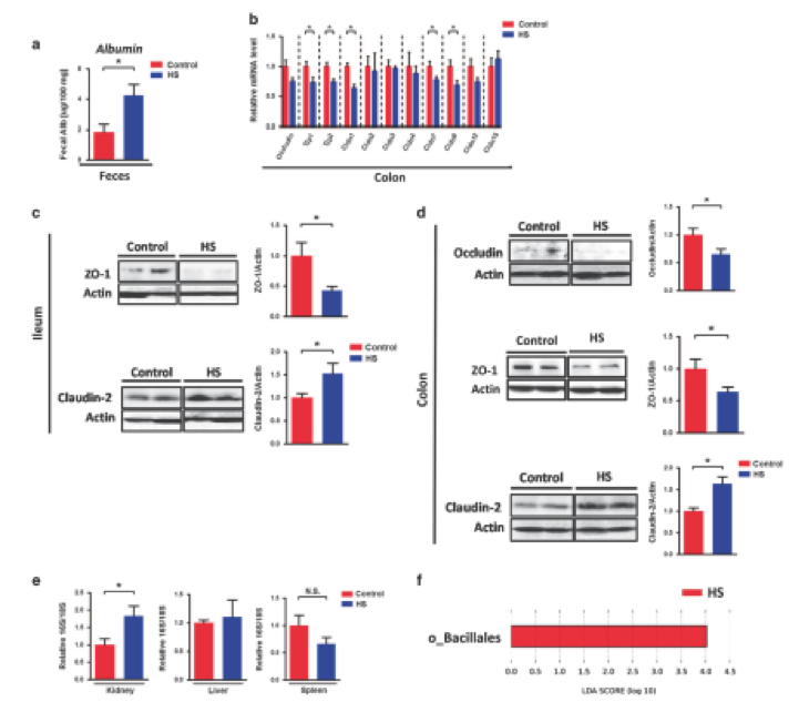 腸道免疫反應(yīng)受損始終與腸道屏障功能障礙有關(guān),研究人員研究了HS的攝入如何影響腸道屏障功能。HS攝入顯著降低了tjp-1,tjp-2,claudin-1,claudin-7和claudin-8基因的表達(dá)(圖4a)。 此外,與對照小鼠相比,HS攝入后,回腸和結(jié)腸中屏障形成的緊密連接ZO-1蛋白水平和結(jié)腸中的Occludin蛋白水平顯示出較低的趨勢(圖4c和d)。 另一方面,在HS喂養(yǎng)回腸和結(jié)腸后,成孔緊密連接蛋白Claudin-2蛋白水平顯著較高(圖4c和d)。這些數(shù)據(jù)清楚地表明腸道腸道屏障被慢性HS攝入所破壞。