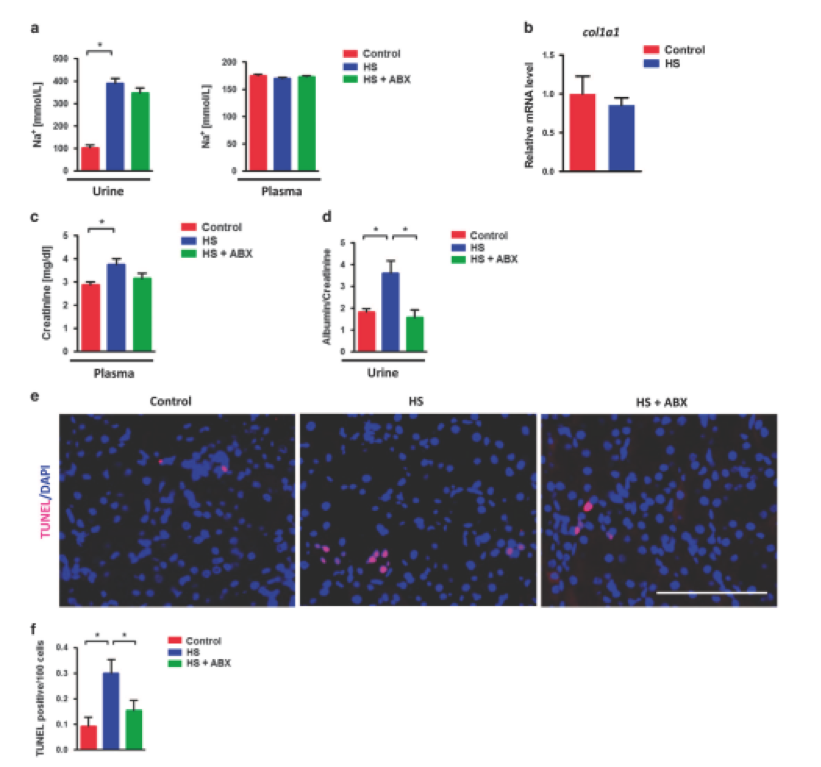 為了進(jìn)一步闡明HS攝入后腸道生態(tài)失調(diào)和腎損傷之間的關(guān)系,給小鼠喂養(yǎng)多粘菌素B和新霉素??股亟o藥確實(shí)恢復(fù)了HS飼喂誘導(dǎo)的回腸Ifn-γ過表達(dá),通過糞便白蛋白和FD-4滲透監(jiān)測腸道泄漏,以及通過血漿內(nèi)毒素水平和腎臟16s / 18s比率監(jiān)測的細(xì)菌移位,通過尿和血漿Na +濃度測量,抗生素不改變鈉負(fù)荷(圖5a)。雖然8周HS喂養(yǎng)并未引起纖維化等進(jìn)展性腎損傷,但由col1a1 mRNA水平監(jiān)測(圖5b),HS喂養(yǎng)增加了血漿肌酐水平。更重要的是,與對照組小鼠相比,HS-喂養(yǎng)小鼠腎功能障礙的主要標(biāo)志物尿白蛋白/肌酐比率顯著增加,抗生素治療幾乎可以完全恢復(fù)腎功能(圖5d)。另外,TUNEL染色顯示抗生素施用可以降低HS誘導(dǎo)的凋亡細(xì)胞的升高(圖5e和f)??傊?,該數(shù)據(jù)表明,抗生素治療能夠改善腸道滲漏和HS喂養(yǎng)引起的早期腎損傷。