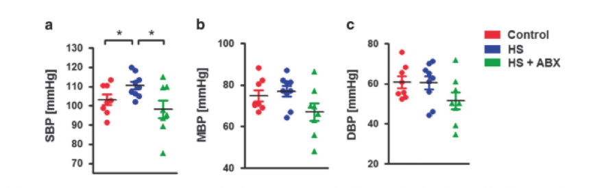 慢性HS喂養(yǎng)可能導(dǎo)致動脈壓升高,并且研究人員還檢測到抗生素如何影響這種進(jìn)展。 如圖6所示,雖然HS處理的小鼠的DBP和平均血壓沒有增加,但是慢性HS喂養(yǎng)后SBP明顯升高。 有趣的是,抗生素治療能夠完全恢復(fù)海拔。 這些數(shù)據(jù)強(qiáng)烈表明慢性HS喂養(yǎng)引起的SBP升高取決于腸道微生物群。