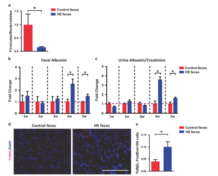 最后,為了進(jìn)一步證明腸道微生物群是腎損傷發(fā)展的上游因素,進(jìn)行了糞便微生物群移植實(shí)驗(yàn)。喂食正常飲食(不是高鹽)的兩組小鼠口服來自對照和HS處理的小鼠的糞便。8周后,接受對照糞便的對照小鼠的盲腸壁Firmicutes/Bacteroidetes比例(其是微生物群組成改變的主要標(biāo)志)顯著高于接受HS糞便的HS小鼠,其為 與研究人員之前的數(shù)據(jù)一致,表明HS喂養(yǎng)降低了盲腸中的Firmicutes / Bacteroidetes比例,并證明該糞便微生物群移植實(shí)驗(yàn)是成功的(圖7a)。此外,如圖7b和c所示,給藥后4周,由糞便白蛋白含量監(jiān)測的腸道通透性在接受HS喂養(yǎng)糞便的小鼠中顯著增加,并且重要的是,尿白蛋白/肌酸酐比率(目前研究中觀察到的腎功能障礙的主要表型)在移植后4周接受HS喂養(yǎng)的糞便的小鼠中也顯著增加。最后,與對照小鼠相比,HS糞便移植小鼠中腎臟凋亡細(xì)胞的數(shù)量顯著增加(圖7d和e)。這些數(shù)據(jù)進(jìn)一步表明,HS喂養(yǎng)引起的腸道生態(tài)失調(diào)是腎損傷和功能障礙的原始誘因。