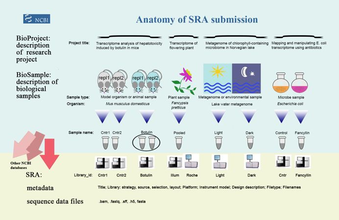 有過數(shù)據(jù)上傳經(jīng)歷的童鞋應(yīng)該對(duì)SRA并不陌生,上傳數(shù)據(jù)前我們一般要?jiǎng)?chuàng)建BioProject、BioSample,用于詳細(xì)說明項(xiàng)目信息、樣品信息;并通過SRA的Experiment、RUN描述建庫(kù)測(cè)序相關(guān)信息,如建庫(kù)類型、測(cè)序儀器、單雙端等;下圖概括出了幾者之間的關(guān)系。