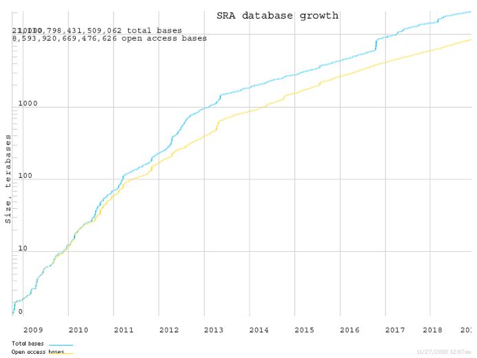 SRA數(shù)據(jù)庫(kù)中存儲(chǔ)的是高度壓縮后的sra格式數(shù)據(jù),截止到目前,SRA中已經(jīng)累計(jì)存儲(chǔ)了超過20P堿基數(shù)據(jù),而且每年仍在以極快的速度增長(zhǎng)。